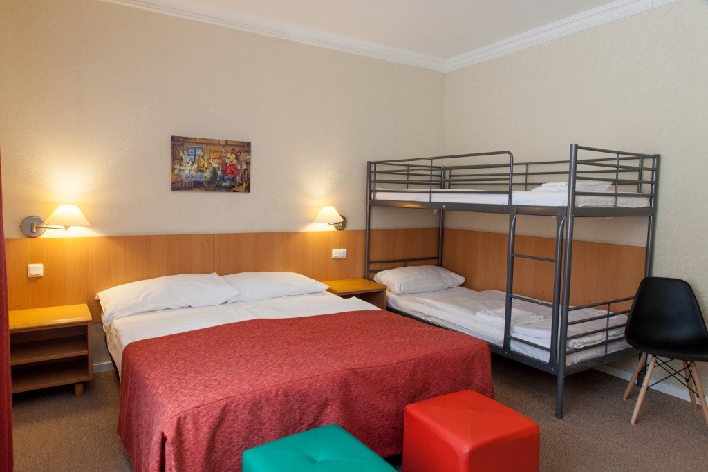 | Семейный однокомнатный - однокомнатный номер для четырёх человек. В комнате две кровати: двуспальная и двухъярусная, сейф, кондиционер, телевизор, телефон, холодильник, туалетные принадлежности. |