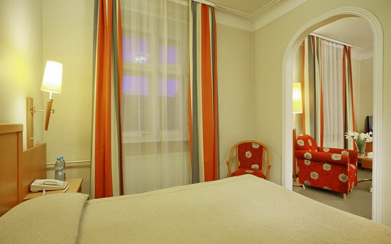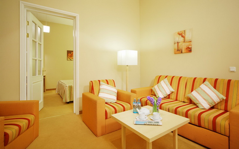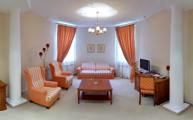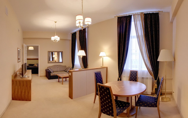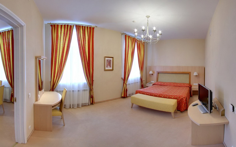 | Люкс - двухместные номера расположены на 2 – 5 этажах, имеют две комнаты. Общая площадь номера ~ 50 кв.м. В гостиной – удобная мягкая мебель (диван и кресла), журнальный столик, телевизор с дистанционным управлением, холодильник, термос, сейф, фен. В номерах спальня с кроватью king-size. Во всех номерах кондиционеры, спутниковое и кабельное телевидение, телефоны. Современная сантехника. Вид из окон на Лиговский проспект и во внутренний двор. |