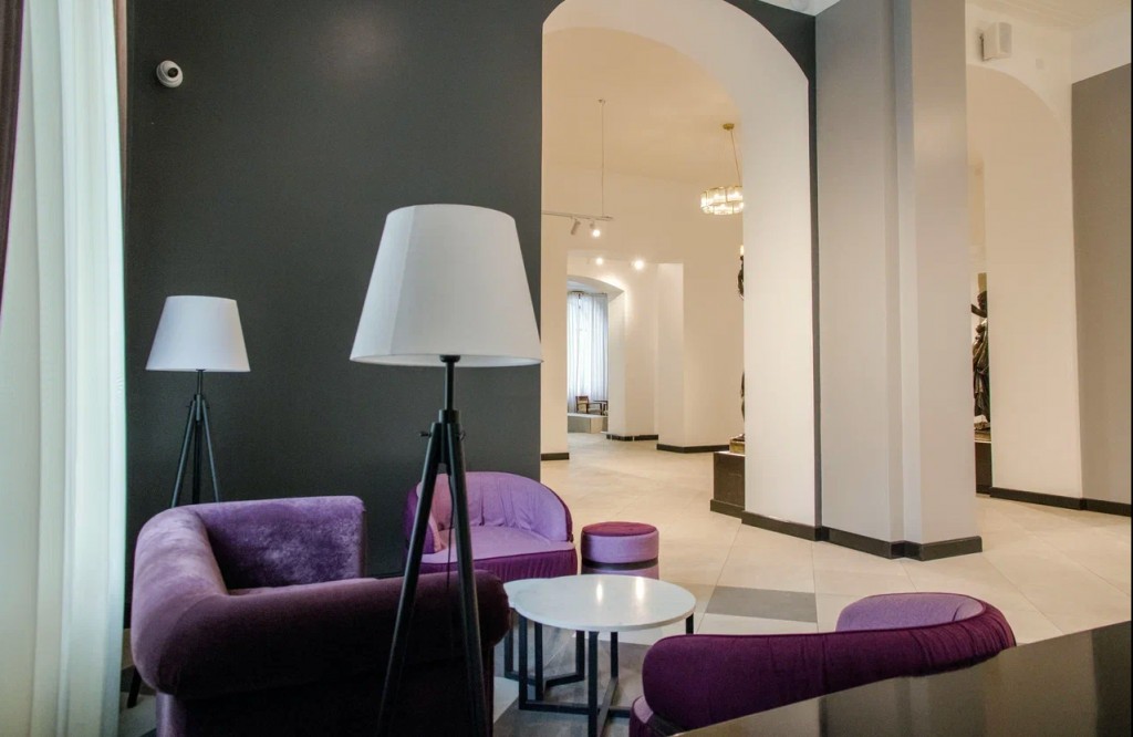| Сьют - двухместные номера расположены на 2 и 3 этажах. Площадь номера ~ 80 кв.м. Всего в гостинице 4 номера и каждый отличается от других неповторимым интерьером и стилем. В двух номерах – рояль (белый и черный рояль). В номере - спальня с просторной кроватью king-size, гостиная с мягкой мебелью, кабинет, ванная комната с биде, гостевой туалет. Номера оснащены современным оборудованием, включая кондиционер, спутниковое и кабельное телевидение (телевизор с дистанционным управлением), телефон, фен, холодильник, сейф, электрочайник, набор чайной посуды, чай/кофе . Вид из окна на Лиговский проспект. |