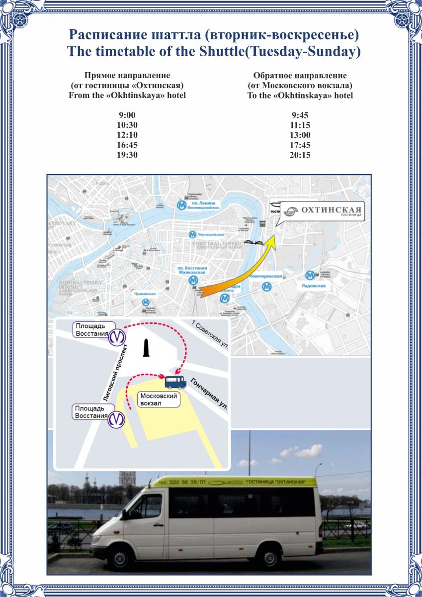 Как добраться: 20 минут езды от ст. метро Площадь Восстания (Московский вокзал) на автобусах № 105, 22, маршрутных такси № 28, 190, 156, 51, 18К; 10 минут от ст. метро Новочеркасская на трамвае № 46, 23, 7 или маршрутных такси № 95, 254. Бесплатный шаттл-автобус ежедневно курсирует по расписанию от гостиницы до центра города (пл. Восстания) и обратно.Расписание бесплатного шаттла Вы можете посмотреть здесь.